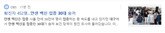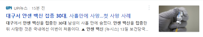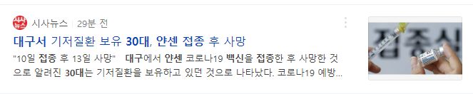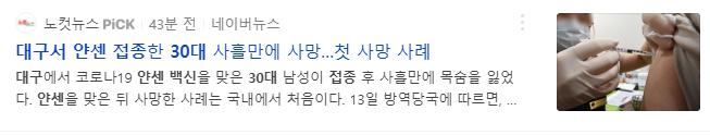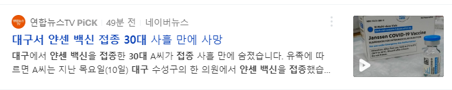 대구에서 얀센 백신을 접종한 30대가 접종 사흘 만에 숨졌습니다. 신종 코로나바이러스(코로나19) 감염증과 관련해 얀센 백신을 접종한 뒤 사망한 것은 이번이 처음인 것으로 알려졌습니다. 얀센 코로나19 백신을 접종한 후 사망한 것으로 알려진 30대는 기저질환을 보유하고 있던 것으로 나타났습니다.