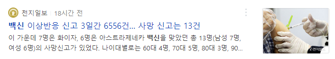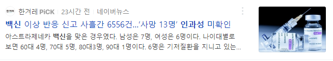 코로나19 백신 접종 관련 사망자가 총 316명으로 불어났습니다. 그 과정에서 인과성이 확인된 사례는 한건도 없었습니다. 코로나19 예방접종 대응추진단에 따르면 지난 2월 26일 코로라 19 백신 접종이 시작된 후 이날 현재까지 사망 신고는 누적 235명입니다. 이 가운데 화이자 백신 접종자가 152명, 아스트라제네카 백신 접종자가 83명입니다. 다른 증상으로 먼저 신고됐다가 상태가 악화해 사망한 사례까지 모두 포함하면 사망자는 총 316명입니다. 국내에서 백신 접종이 시작된 2월 26일 이후 신고된 이상반응 의심 신고는 누적 4만 4798건으로 집계됐습니다. 이는 이날 0시 기준 국내 1, 2차 누적 접종 건수(1308만 7386명)의 0.32% 수준입니다. 백신 종류별로 보면 아스트라제네카 3만 4528건, 화이자 9982건, 얀센 288건입니다. 누적 접종 건수 대비 이상반응 신고율은 아스트라제네카 백신 0.41%, 화이자 백신 0.20%, 얀센 백신 0.06%입니다. 중증 전신 알레르기 반응인 '아나필락시스' 의심 사례는 누적 307건(아스트라제네카 218건, 화이자 71건, 얀센 18건)이고, 주요 이상반응 의심 신고는 누적 1768건(아스트라제네카 1049건, 화이자 711건, 얀센 8건)입니다. 전체 이상반응 신고의 94.8%인 4만 2488건은 접종 후 흔하게 나타날 수 있는 근육통, 두통, 발열, 오한, 메스꺼움 등 비교적 경미한 사례였습니다. 지난 9∼11일 백신을 맞은 뒤 이상반응이 의심된다고 보건당국에 신고한 신규 사례는 총 6556건(아스트라제네카 5424건, 화이자 844건)입니다. 지난 10일부터 접종이 시작된 얀센 백신은 이틀간 288건의 이상 반응 신고가 들어왔습니다. 날짜별로는 9일 1859건, 10일 2125건, 11일 2572건입니다. 이 중 사망신고는 13명 늘어났습니다. 7명은 화이자, 6명은 아스트라제네카 백신을 맞았습니다. 아나필락시스 의심 신고는 40건 늘었습니다. 이 중 18건이 얀센, 15건이 아스트라제네카, 7건이 화이자 백신 관련 사례입니다. '특별 관심 이상반응' 사례나 중환자실 입원, 생명 위중, 영구장애와 후유증 등의 사례를 아우르는 주요 이상반응 사례는 253건(아스트라제네카 202건, 화이자 43건, 얀센 8건)이 새로 신고됐습니다. 나머지 6250건은 접종 부위 통증과 부기, 발열, 두통 등의 증상이 나타나 일반 이상반응으로 분류됐습니다. 방역당국은 매주 월•수•토요일 세 차례에 걸쳐 접종 후 이상반응 신고 통계를 발표합니다.