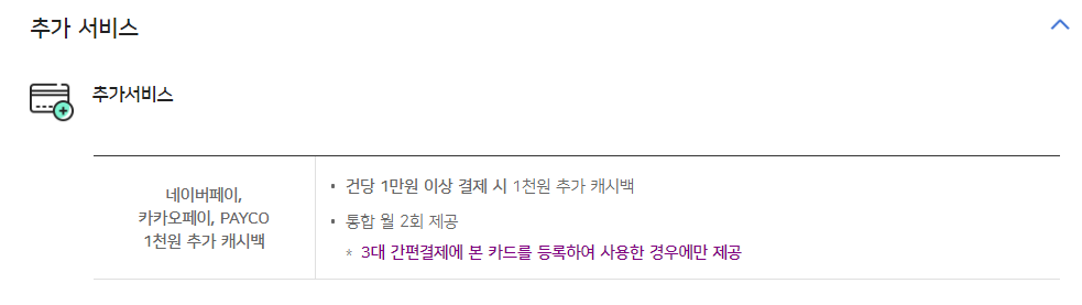 ① 전월실적조건없이 국내, 해외 이용금액의 1% 네이버 페이 포인트로 적립 월 적립한도 각 1만 포인트