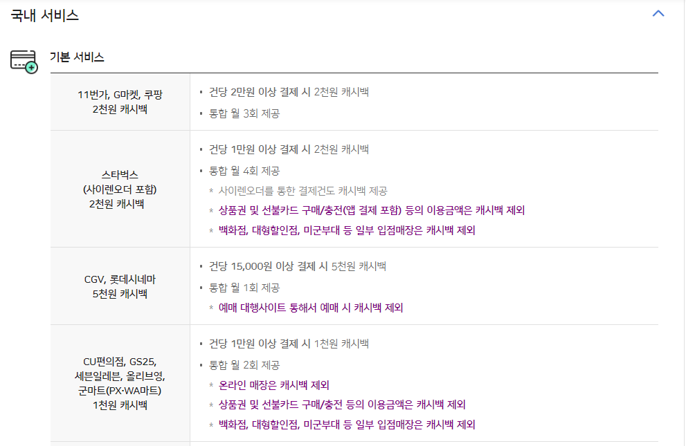 ③ 해외 가맹점 이용금액의 1% 기본 캐시백 30만 원 이상이면 2% 제공 (단 국내 이용실적 20만 원 이상시)