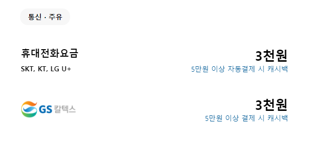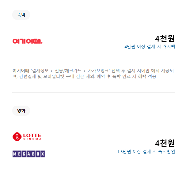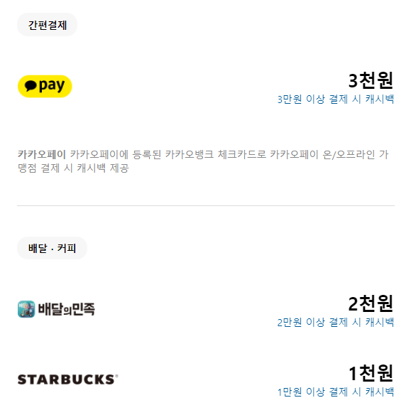 카카오페이로 3만 원 이상 결제 시 3천 원 배민 2만원 이상 결제 시 2천 원 스타벅스 1만 원 이상 결제 시 1천 원 넷플릭스 9천 원 이상 결제 시 1천 원 지마켓, 신세계 5만 원 이상 결제 시 5천 원 핸드폰 요금 5만 원 이상 결제 시 3천 원 GS칼텍스 5만 원 이상 3천 원 여기 어때 4만 원 이상 4천 원