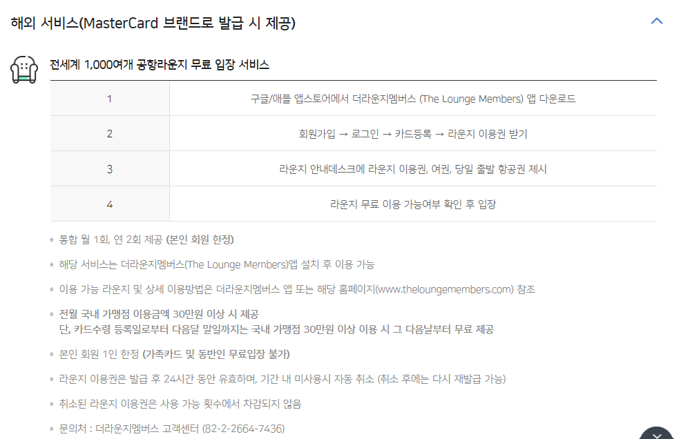 ② 더 라운지 멤버스 공항 라운지 무료 이용 (전월 실적 30만 원 이상) 월 1회 연 2회 제공