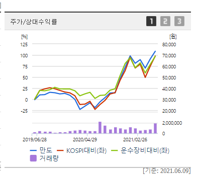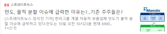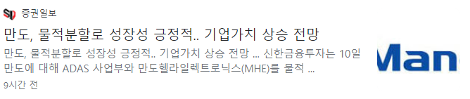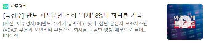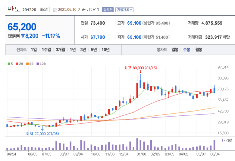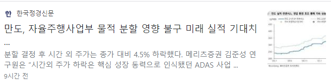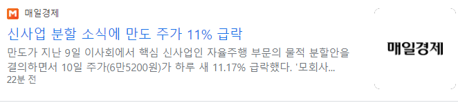 만도가 자율주행(ADAS) 부문 물적 분할하기로 했다는 소식이 알려지자 주가는 10%대 급락했습니다. 10일 만도의 주가는 전 거래일 대비 8200원(11.17%) 내린 6만 5200원에 거래를 마쳤습니다. 최근 연일 오름세를 이어갔으나 닷새만에 급 반락하고 만 것입니다. 분할되어 미치는 영향은 제한적이지만 주주가치의 희석을 우려한 투자매물이 쏟아지면서 급락한 것으로 풀이됩니다.