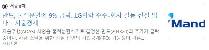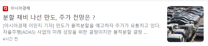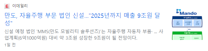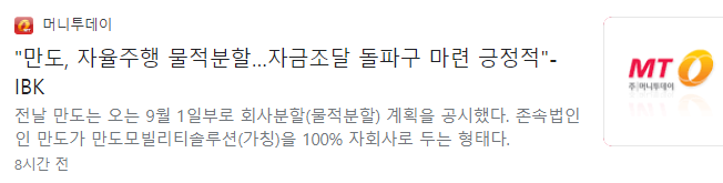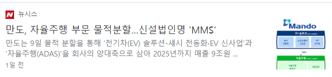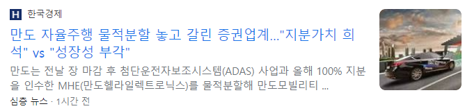 전날 만도는 자율주행 사업 물적 분할 안을 이사회에서 결의했습니다. 만도를 ‘새시(제동ㆍ조향ㆍ현가) 전동화 기반 EV 설루션 전문기업’으로 성장시키고, 자율주행 부문은 분사해 ‘자율주행 전문기업’으로 키운다는 것입니다. 신설 법인의 이름은 만도 모빌리티 솔루션즈(가칭, 이하 MMS)입니다. 분할 안은 내달 주주총회에 상정될 예정이며 분할 기일은 9월 1일입니다. 표면 상으로는 회사만 쪼갠 듯 하지만, 만도는 신설법인 MMS의 지분 100%를 보유하게 되지만, 앞으로 기업공개(IPO) 또는 외부 지분 투자 가능성을 열어놨습니다. 이런 이유로 주식시장에서는 주주 가치 하락에 대한 우려가 커진 상태입니다.