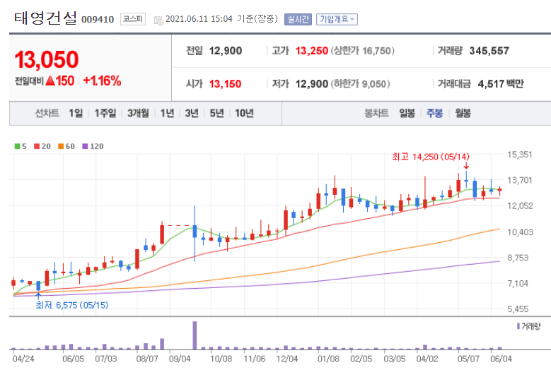 태영그룹 윤석민 회장이 하버드대 경영대학원 석사 출신으로 건축, 토목, 플랜트, 주택사업 등 모든 건설사업 을 하고 있으며 환경 플랜트 사업과 신재생에너지 사업도 추진하고 있는 것으로 확인됩니다. 현재 시가총액 5,096억 원으로 위 기업들과 다르게 코스피에 상장되어 350위에 해당하는 기업입니다. 다른 종목들과 다르게 이준석 테마주로 엮이고 나서의 주가 영향은 큰 차이가 없는 듯합니다.