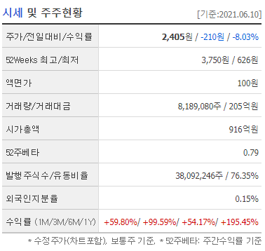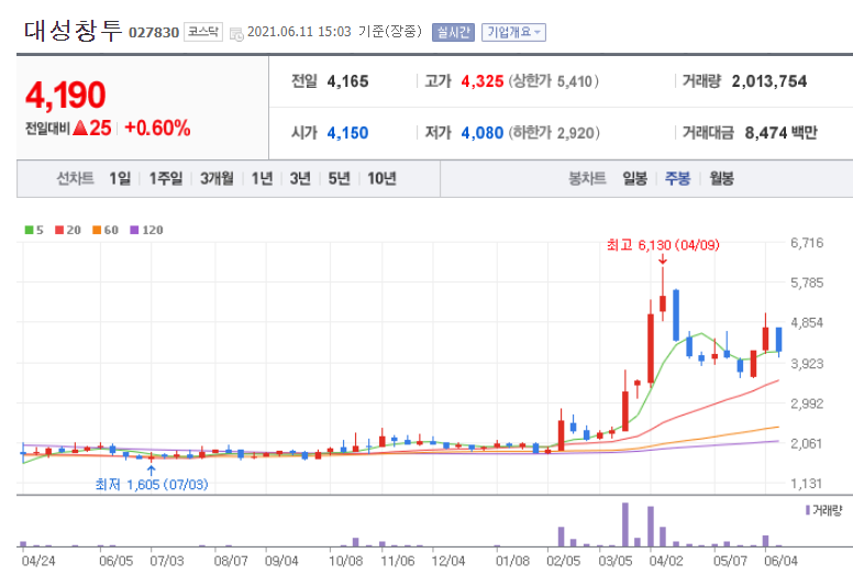 태성창투 또한 김영훈 대표가 하버드대학원을 나왔다는 점에서 테마주로 엮여있으며 1987년 설립된 벤처캐피털로 다양한 기업에 투자를 하며 사업 타당성과 분석을 통해 투자 결정을 하고 지속적으로 지원을 하며 투자수익을 극대화하고 있습니다. 현재 시가총액 1,852억 원으로 코스닥 572위에 해당하는 기업입니다. 지속적으로 주가가 상승하다가 마찬가지로 5월 31일에 10% 이상 급등하는 모습을 보여줬죠. 이미 태성 창투는 하반기 IPO 시장의 대어로 꼽히는 크래프톤 관련주로 이미 주가가 많이 상승한 상태이기도 합니다.