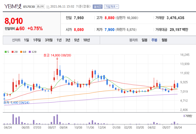 민선식 YBM 사장이 이준석 신임당대표와 같은 하버드대학교 대학원 경영학 박사 출신으로 스마트러닝 교육업체이면서 온라인 교육이나 테스트 및 디지털 콘텐츠 판매사업을 하고 있습니다. 현재 시가총액 1,429억 원의 코스닥 737위에 해당하는 기업입니다. 지난 5월 31일에 거래량이 급증하며 주가도 22% 이상 급등하는 모습을 보여줬습니다.