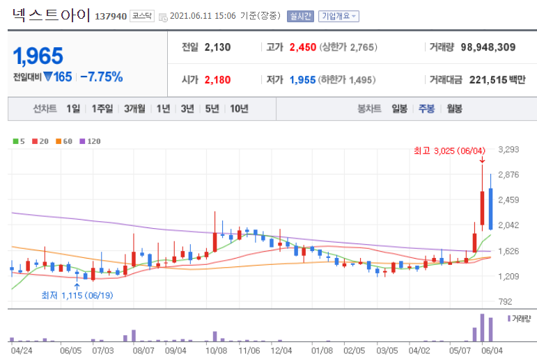 넥스트아이의 매출액은 작년 연결기준 347억 원 수준으로 비교적 규모가 작은 기업입니다. 그렇기에 이준석 관련주로 평가되면서 큰 폭의 주가 상승률을 보여주고 있습니다. 1천 원 초반대 박스권을 형성하던 넥스트아이의 주가는 이번 이준석 테마주 이슈를 타고 2천 원을 돌파하였습니다. 이준석 전 최고위원의 부친이 2019년까지 넥스트아이의 감사위원으로 재직하였던 기업이기에 관련도에 있어선 가장 높은 기업이라고 평가할 수 있습니다.