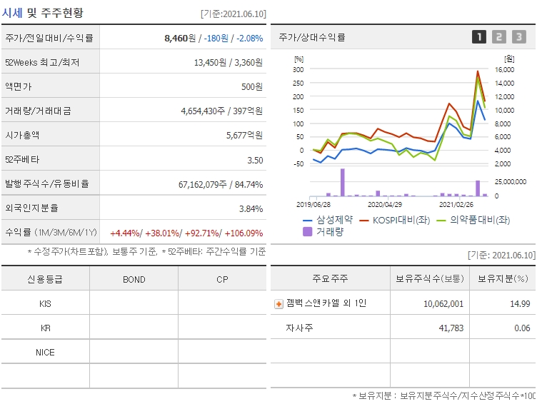 6월 11일 코스피 지수는 전일 대비 24.68 포인트 약 0.77% 오른 3249.32로 거래를 마쳤습니다. 하지만 삼성제약은 외국인과 기관의 동시 매도로 6일째 하락을 이어가며 8,200원(-3.07%)으로 마감했습니다. 이는 1일을 제외하고 26일부터 3일까지 30% 미만의 상승폭을 기록한 뒤 4일부터 10일까지 5 거래일 연속에 이은 건데요 췌장암 신약인 리아백스주의 국내 임상 3상 결과를 미국 임상종양학회(ASCO) 대회에서 발표한 후 삼성제약 공매도는 지난 6월 4일 1000주 이상 급증한 후 다시 두 자리 숫자로 줄어들었지만 하락세를 멈추진 않았습니다.