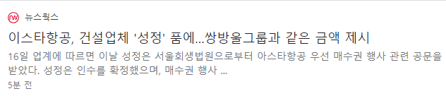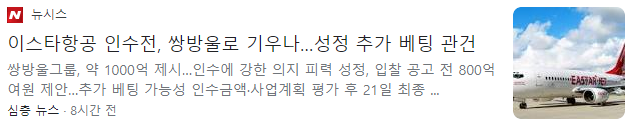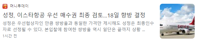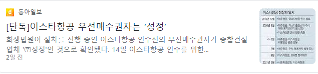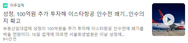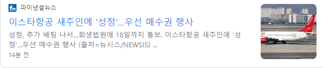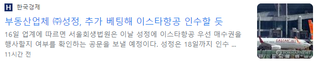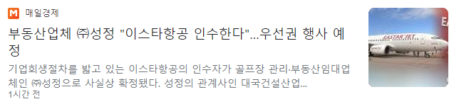 기업회생절차를 밟고 있는 이스타항공의 인수자가 종합건설업체 ㈜성정으로 사실상 확정됐습니다. 성정은 약 1100억여 원에 이스타항공을 인수하기로 결정했으며 구체적인 회생계획안을 내달 말 법원에 제출할 예정입니다. 16일 투자은행업계에 따르면 이날 오전 서울 회생 법원과 매각주관사 딜로이트안진은 이스타항공 본입찰에 참여한 쌍방울•광림 컨소시엄의 입찰가액과 관련 조건을 성정 측에 통보했으며, 성정은 가계약 금액보다 높은 가격을 수용하는 방식으로 우선매수권(콜옵션)을 행사하기로 했다고 전했습니다.