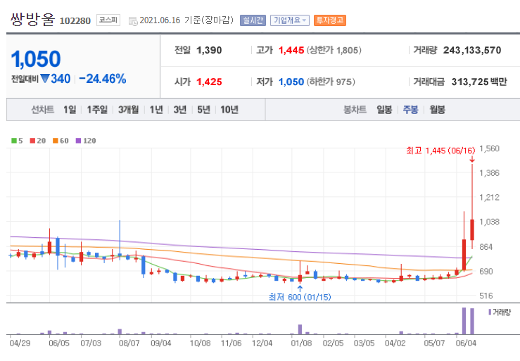 16일 성정의 우선매수권 행사소식이 알려지자 쌍방울 주가는 전날보다 24.46%(340원) 급락한 1050원에 장을 마감했습니다. 쌍방울그룹은 최근까지 이스타항공 인수를 두고 성정과 경쟁해왔습니다. 이날 성정이 우선 매수권을 행사해 이스타항공 인수를 확정 지었다는 소식이 퍼지면서 쌍방울그룹에 대한 주주들의 기대감도 가라앉으며, 주가에도 영향을 주고 말았습니다.