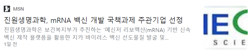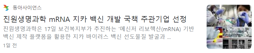 진원생명과학[011000]은 보건복지부가 추진하는 '메신저 리보핵산(mRNA) 기반 신속 백신 제작 플랫폼을 활용한 지카 바이러스 백신 선도물질 발굴 및 유효성 평가' 국책과제의 주관기관으로 선정됐다고 17일 밝혔습니다. 세부 기관은 한국 과학기술연구원(KIST) 방은경 박사 연구팀, 공동연구기관은 남재환 가톨릭대 교수 연구팀입니다. 정부는 19개월간 연구비 7억 9천200만 원을 지원합니다.