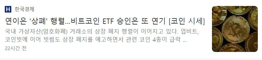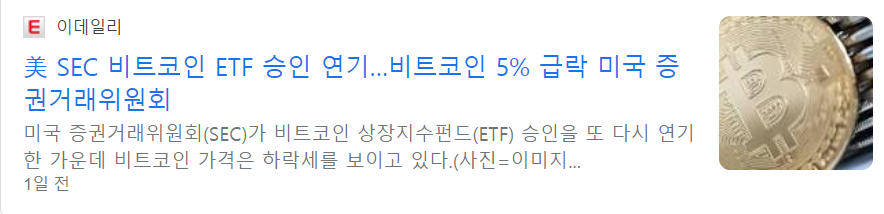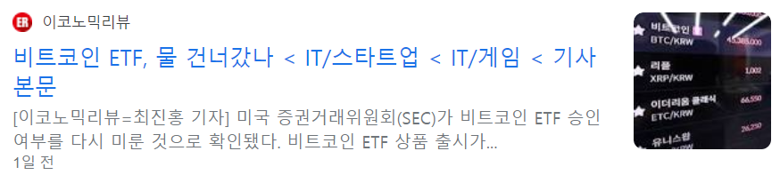 마켓워치에 따르면 SEC는 금융사 반에크가 신청한 비트코인 ETF와 관련해 승인 결정을 연기했다고 발표했다. SEC는 비트코인 ETF가 조작에 취약한지 알아보고자 한다며 연기 이유를 밝혔다. 비트코인은 하락세를 보이는 암호화폐 거래소에서는 알트코인(비트코인, 이더리움 등 외 암호화폐)들은 급등세를 보이고 있다.