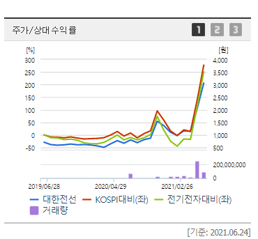 1일 대한전선 주가는 등락을 보이다가 전 거래일보다 0.25% 오른 2040원에 장을 마쳤습니다. 전날에는 20.77% 급등한 2035원에 마감하며, 5 거래일 간 주가 상승률이 54.75%를 기록한 바 있습니다. 앞서