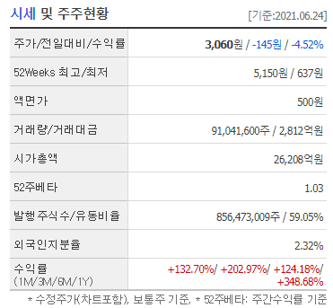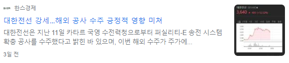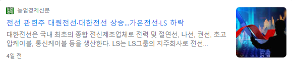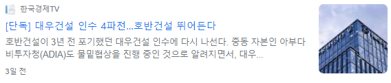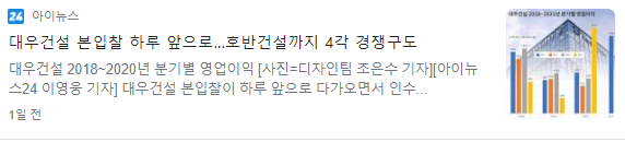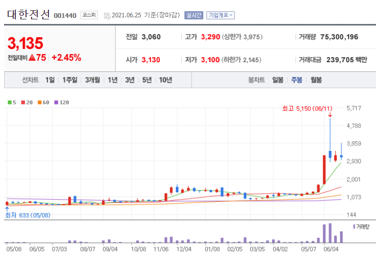 25일 대한전선 주가가 전일 대비 2.45% 오른 3,135원을 기록하며 장을 마감했습니다. 이날 대한전선 주가의 강세는 최대 주주인 호반이 대우건설 인수 전 참여 소식에 주가가 영향을 받은 것으로 풀이되고 있습니다. 외국인은 지난 4 거래일 동안 대한전선의 주식을 대량 매수하며 대한전선주가를 끌어올리는데 영향을 준것으로 보입니다.