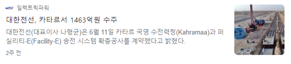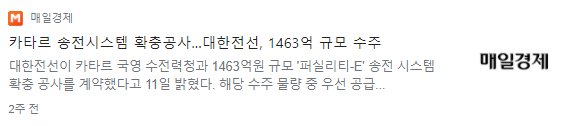 한편 대한전선은 지난 11일 카타르 국영 수전력 청과 1463억 원 규모의 '퍼실리티-E' 송전 시스템 확충 공사 계약을 체결했습니다. 우선 공급 물량은 277억 원 규모고 추후 공급 물량인 1186억 원 규모의 후속 구간을 포함하면 총 계약 금액이 1463억 원에 달합니다. 1186억 원 규모의 후속 공급 물량의 정확한 액수는 1년 안에 확정될 예정입니다. 회사 관계자는 "유럽, 일본 등 유수의 글로벌 업체들과 치열한 각축전에서 카타르 정부의 중요 사업인 퍼실리티-E 프로젝트를 수주한 것은 대단히 의미 있는 성과입니다. 안정적인 전력 수급을 위한 랜드마크적인 사업의 수주는 대한전선이 기술력과 품질을 기반으로 글로벌 시장에서 선도적 지위를 확보하고 있다는 것을 의미한다"라고 말했습니다. 증권 전문가들은 호반 건설이 대우건설 인수를 성사시킨다면 대한전선 주가 역시 긍정적인 모멘텀을 가질 수 있을 전망이라고 분석했습니다.