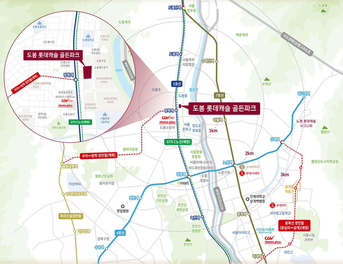 도봉롯데캐슬 골든파크는 예전 빅마켓 도봉점이 위치했던 곳으로 초역세권을 자랑하는 곳에 자리하게 됩니다. 지하철 1호선 방학역이 단지 바로 앞에 위치하게 되며 GTX가 들어오는 창동역과는 1 정거장 차이입니다. 또한 서울 중심가까지 30분이면 도착이 가능하며 우이~방학 경전철도 연장되어 있어 교통으로는 매우 우수한 입지를 가지고 있습니다. 단지 주변에는 홈플러스, 복합쇼핑몰이 있으며 CGV등이 입주를 예정하고 있으며, 근거리에 도봉구청이 있습니다. 학군의 위치도 근거리에 위치하여 모두 도보로 이동이 가능하며, 중계동 학원가도 자차 및 학원차량으로 이동이 가능한 거리입니다.