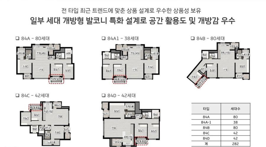 지하 4층~지상 23층 규모로 282세대가 공급되며, 전평형은 국평이라는 84㎡ 단일면적으로 건설됩니다.
