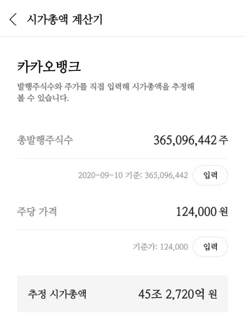 카카오 뱅크의 주가수익비율(PER) 역시 국내 금융지주사 대비 한참 높게 측정됐다. 금융감독원 전자공시시스템에 게재된 지난해 사업보고서에 따라 단순 계산하면 카카오뱅크의 PER은 360.49배에 이른다. PER이 높을수록 고평가 상태로 해석된다. 국내 금융지주사의 PER 및 추정 PER은 △KB금융 6.98배‧5.84배 △신한지주 6.17배‧5.54배 △하나금융지주 5.29배‧4.71배 △우리금융지주 6.08배‧4.15배 등이다. 해당 업종의 평균 PER은 5.91배다.증권가에서는 카카오뱅크 기업 가치를 10~20조 원 대 수준으로 추산하는 분위기다.