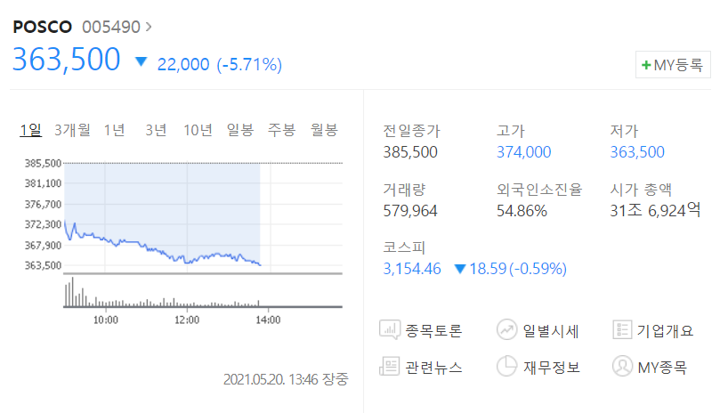 최근 강세를 보이던 포스코의 주가가 중국의 철강시장 가격 변동성 규제에 약세로 돌아서며 40만 원까지 치솟았던 주가는 30만 원대로 하락했습니다. 포스코의 1분기 실적이 매우 우수했던 만큼 기대감이 높았으나, 예상치 못한 중국발 암초를 만나 주가 하락에 영향을 면치 못했습니다. 하지만 대부분의 증권 전문가는 포스코의 하락은 단발성으로 그칠 것이며 앞으로 성장성이 더 크다고 관측하였습니다. 20일 현재 포스코의 주가는 전일 대비 5.71% 떨어진 363,500원입니다.