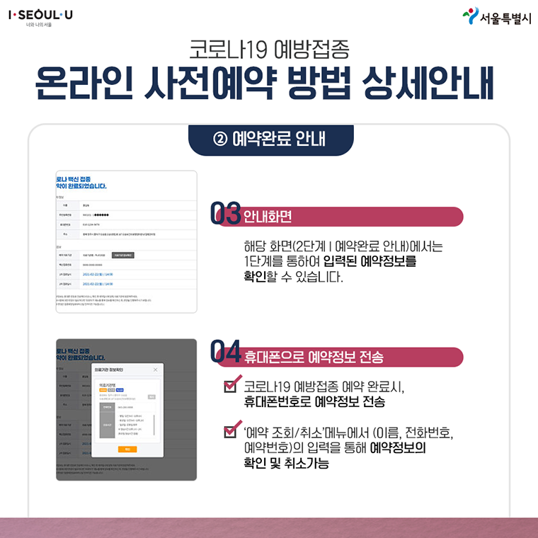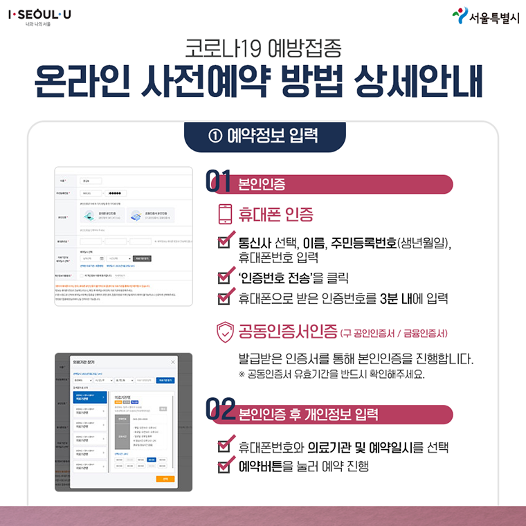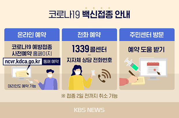 온라인 예약방법 ① 홈페이지 접속 후 본인 인적정보 입력 및 본인인증 후 ② 접종장소와 접종 일시를 선택하여 예약 대리인 예약 ① 예약자(대리인)의 인적정보 입력 및 대리인 인증 후 ② 접종장소와 접종 일시를 선택하여 예약 (온라인 대리인 예약의 경우, 대리인 자격 제한 없음) 온라인 사전예약을 하기 위해선 본인인증을 거쳐야 합니다. 본인인증은 휴대폰 또는 공동 인증서로 확인이 가능합니다. 휴대폰 인증은 통신사 선택, 주민등록번호(생년월일), 휴대폰 번호 입력 후 ‘인증번호 전송’을 클릭, 휴대폰으로 받은 인증번호를 3분 내에 입력하여 본인인증을 진행하면 됩니다. 공동 인증서 인증(구 공인인증서 / 금융인증서)은 발급받은 인증서를 통해 본인인증을 진행하는 방법으로, 공동 인증서 유효기간을 확인해야 합니다. 본인인증이 끝나면 개인정보를 입력합니다. 휴대폰 번호와 의료기관 및 예약일시를 선택, 예약 버튼을 눌러 예약을 진행합니다. 코로나 19 예방접종이 완료되면 예약일시, 접종기관, 접종 백신 종류 등의 정보가 포함된 문자 메시지가 휴대전화로 전송됩니다. ‘예약 조회/취소’ 메뉴에서 이름, 주민등록번호, 예약번호 입력을 통해 예약 내용을 확인할 수 있습니다. 접종 전일 또는 당일, 건강상태가 좋지 않은 경우 예약된 접종기관으로 연락하여 일정을 변경하고 건강상태가 좋은 날 접종을 받으면 됩니다. 접종 2일 전까지는 온라인, 콜센터, 지자체 상담센터를 통해 취소가 가능합니다.