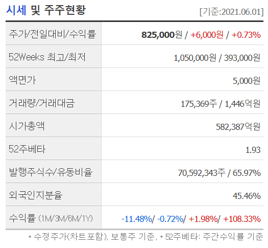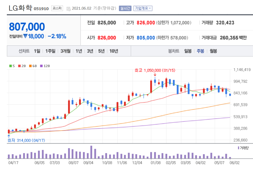 엘지화학 주가 2일 기준으로 1.82% 하락 후 장 마감했습니다. 시가는 826,000원이다. 금일 고가는 826,000원이고, 저가는 805,000원이었습니다. 거래량은 302,999이며 전일대비 15,000원 하락했습니다. 엘지화학읜 주가는 특히 26일 크레디트스위스(CS)의 엘지화학 목표주가를 반토막 내린 보고서 발표 이후 하락세를 면치 못하고 있습니다. 해당 보고서 발표 당일만 6.73% 하락하였고, 지난 2주간 10.63%나 급락하여 투자자들의 애를 태웠습니다.