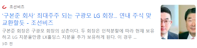 LG와 LX홀딩스의 지분 정리는 연내에는 이뤄질 것으로 보입니다. 분할비율은 0.912 대 0.088입니다. 구광모 LG 회장은 LG 2609만 주와 LX홀딩스 1217만 주를 보유하게 됐고, 구본준 LX홀딩스 회장은 LG 1214만 주와, LX홀딩스 588만 주를 갖게 됐습니다. 지분 정리는 구광모 회장의 LX홀딩스 지분(15.95%)과 구본준 회장의 LG 지분(7.72%)을 맞교환(스왑)하는 형태로 이뤄질 전망입니다. 다만 구본준 회장의 경우 LX홀딩스 자회사로 편입된 LG하우시스와 LG상사 주식을 사들여 안정된 경영권을 확보하는 게 중요하므로 LG 주식의 일부를 매도할 가능성도 있습니다. 이 경우 지분 정리를 통해 구광모 회장의 손에 들어올 구본준 회장의 LG 주식 지분은 예상보다 줄어들어 지분 맞교환 효과는 떨어질 것으로 보입니다. 시장에서는 지분 정리에 대한 윤곽이 드러나기까지 LG와 LX홀딩스의 주가는 지지부진한 움직임을 보일 것으로 관측하고 있습니다.