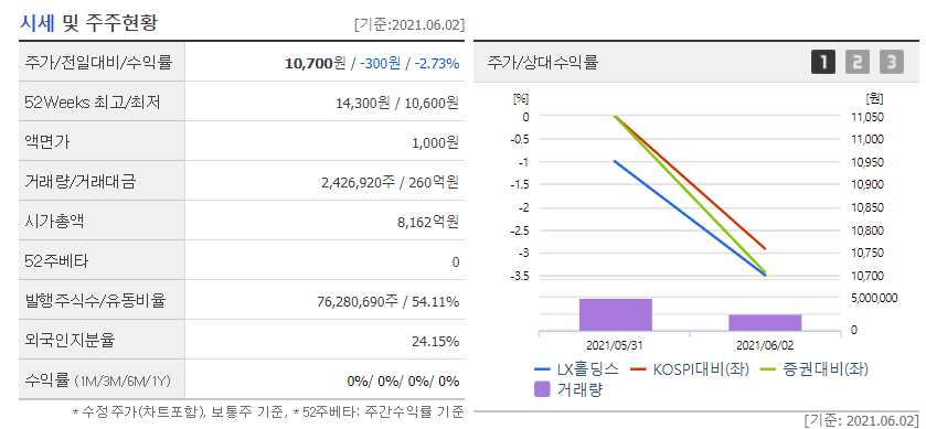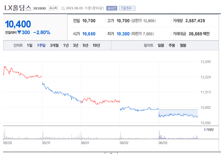 LX홀딩스와 LG하락세를 면치 못하는 모습에 투자자들의 애를 태우고 있습니다. 3일 LX홀딩스는 전일대비 300원 떨어진 10,400원에 거래를 마쳤습니다. LX홀딩스는 상장 이후, 외국인과 기관투자자들의 거센 매도세에 하락이 계속되고 있으며, 부진한 주가 흐름에 투자자들은 지분 정리에 대한 관심이 집중되고 있습니다.