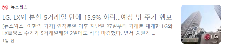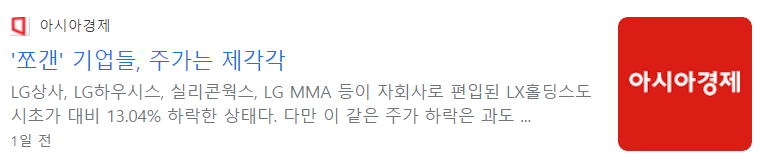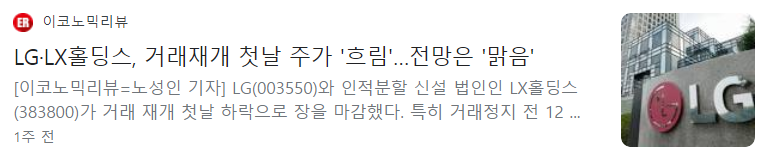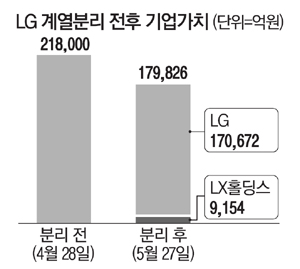 LG는 지난달 1일 LG상사, LG하우시스, 실리콘웍스 등을 자회사로 둔 LX홀딩스와 인적 분할했습니다. 이로 인해 월 29일부터 한 달 간인 5월 26일까지 거래가 중단되기도 했습니다. 분할에 앞서 증권가에서는 LG그룹에 대한 긍정적인 전망이 우세했습니다. 증권가는 L화학, 전자 등 주력사업 강화를 위한 구조적 개편 이라며 신성장 포트폴리오 강화를 기대하는 분위기였습니다. 문에 증권가에서는 이들 관련주의 주가 하락이 과도하다는 분석이 나오고 있습니다. 증권가 연구원에 따르면 주가 하락은 LX홀딩스에 편입된 계열사들이 순자산가치(NAV) 산출 시 제외된 점을 반영한 것으로 추정된다"면서 "편출 된 회사들의 NAV 감소 대비 시가총액 감소가 훨씬 큰 상황으로 과도한 하락”이라고 설명했습니다.